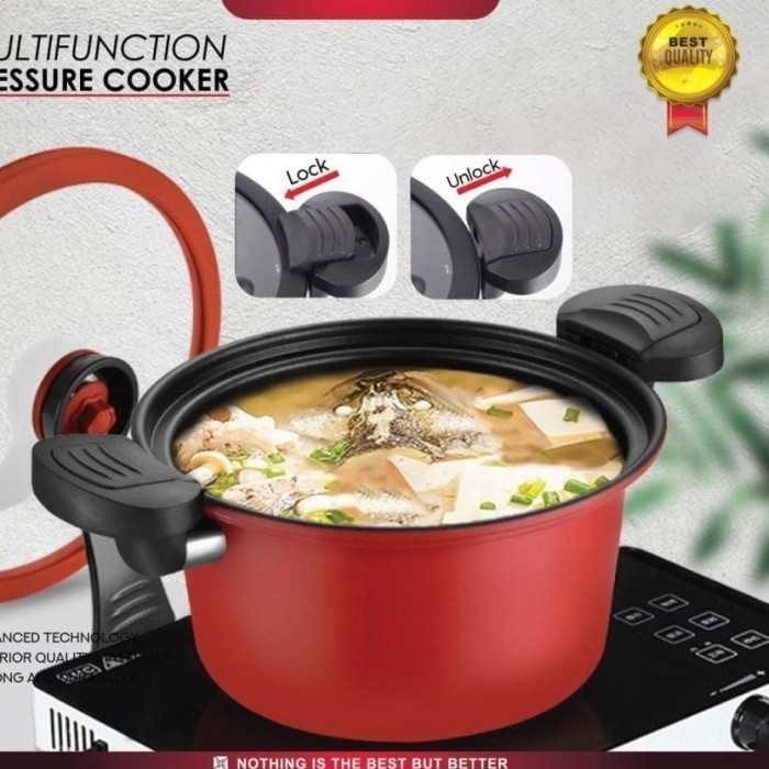 Keunggulan produk: - Kapasitas besar sehingga dapat menampung satu ekor ayam - Praktis, simple, ergonomis dan hemat tempat - Lapisan anti lengket sehingga praktis dan mudah membersihkan minyak - Micro Pressure tekanan 2~3KPA sehingga proses memasak tidak memakan waktu panjang - Penutup transparan dan pengunci rapat sehingga penutup tidak copot atau kendor saat memasak - Fleksible dapat digunakan di berbagai jenis kompor elektrik maupun kompor gas - Gagangan karet anti panas sehingga memudahkan anda saat mengangkat panci - Katup Pelepas tekanan dan penutup dilengkapi dengan karet rapat - Tidak mengandung bahan kimia, nyaman untuk digunakan oleh manusia