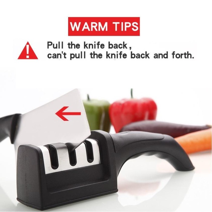--Alat pengasah pisau profesional dengan teknologi termutakhir. -- Berbahan BAJA STAINLESS yang sangat efektif dalam mengasah pisau kamu. -- Pegangan didesain secara ergonomis, pasti pas dalam genggaman. -- Bagian alas berbahan EVA premium, dijamin ANTI SELIP. -- Bagian pengasah bisa dilepas, sehingga mudah untuk dibersihkan. -- DIdesain dengan 3 mata pengasah: kasar, halus, akhir. Hasilnya pasti maksimal. -- 3 step cara mengasah: 5x pengasah kasar, 3x pengasah halus, 3x pengasah akhir. -- Untuk lebih jelas tentang cara pengasahan, bisa dilihat video produk di atas. -- Sudah terbukti sangat efektif dan digunakan oleh para profesional. -- Harga super duper murah! Barang import dengan kualitas premium!