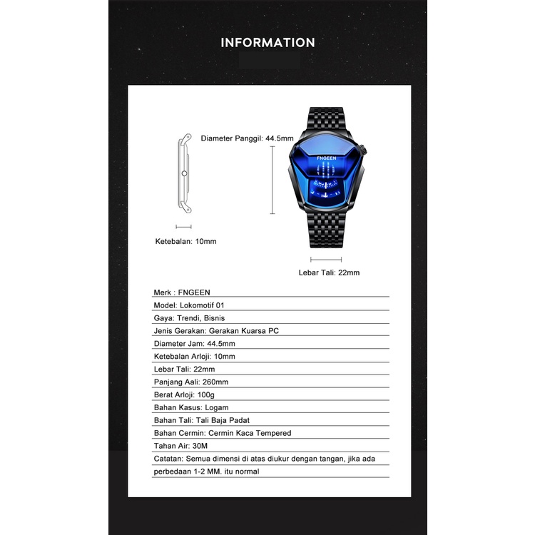 📝【PRODUCT INFORMATION】 Merk : FNGEEN Model: Lokomotif 01 Gaya: Trendi, Bisnis Jenis Gerakan: Gerakan PC Diameter Jam: 44.5mm Ketebalan Arloji: 10mm Lebar Tali: 22mm Panjang Aali: 260mm Berat Arloji: 100g Bahan Kasus: Logam Bahan Tali: Tali Baja Padat Bahan Cermin: Cermin Kaca Tempered Layanan Purna Jual: Garansi Toko (Dalam Waktu Satu Tahun) Tahan Air: 【30M Tahan Air Biasa,Tidak cocok untuk berenang, harap hindari kontak dengan air panas dan uap saat menggunakannya!!!】