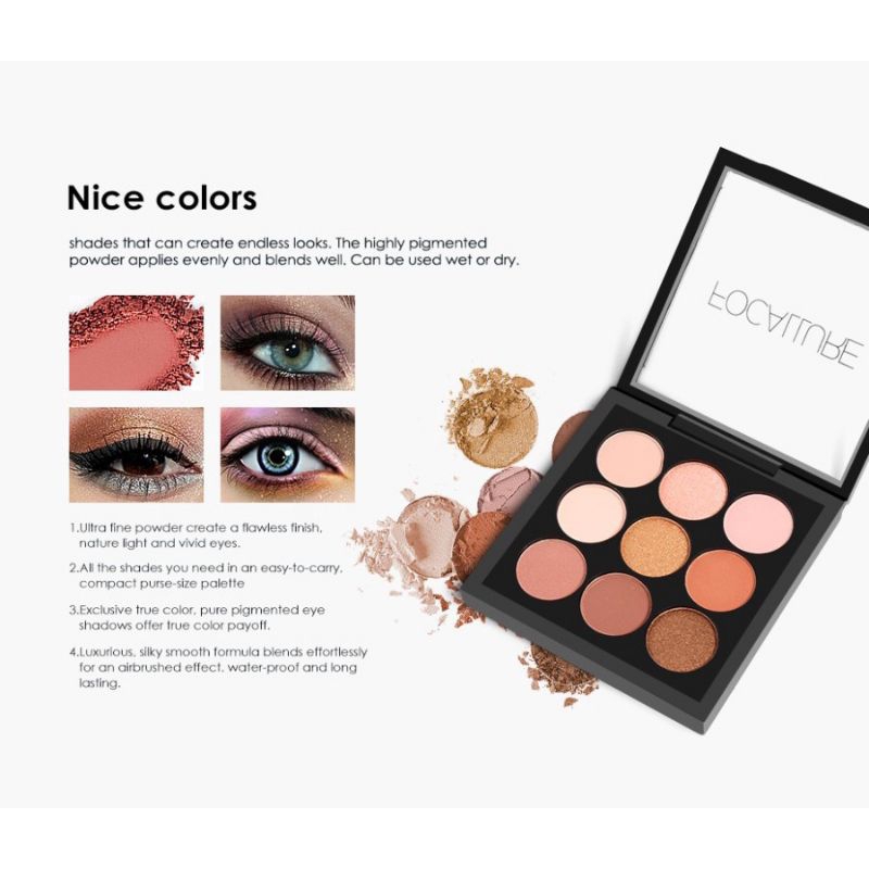 FOCALLURE 9 Colours Eyeshadow Palette merupakan 1 palet eyeshadow yang memiliki 9 warna mewah dan menarik dengan tekstur halus, tahan lama, tahan air, dan mudah menempel pada mata walaupun tidak menggunakan eye primer.