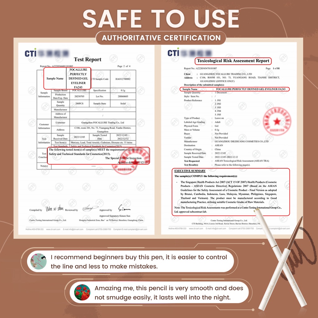 - Merk lain: Tidak tahan lama, mudah pudar, tidak anti air, sulit dipadukan, sulit digunakan - Merk lain: Ujung pensil tebal, Ujung pensil terlalu kering dan sakit ketika menyentuh kulit - Focallure: Tahan lama, anti air, 1.7mm ultra slim, pigmentasi tinggi, halus.