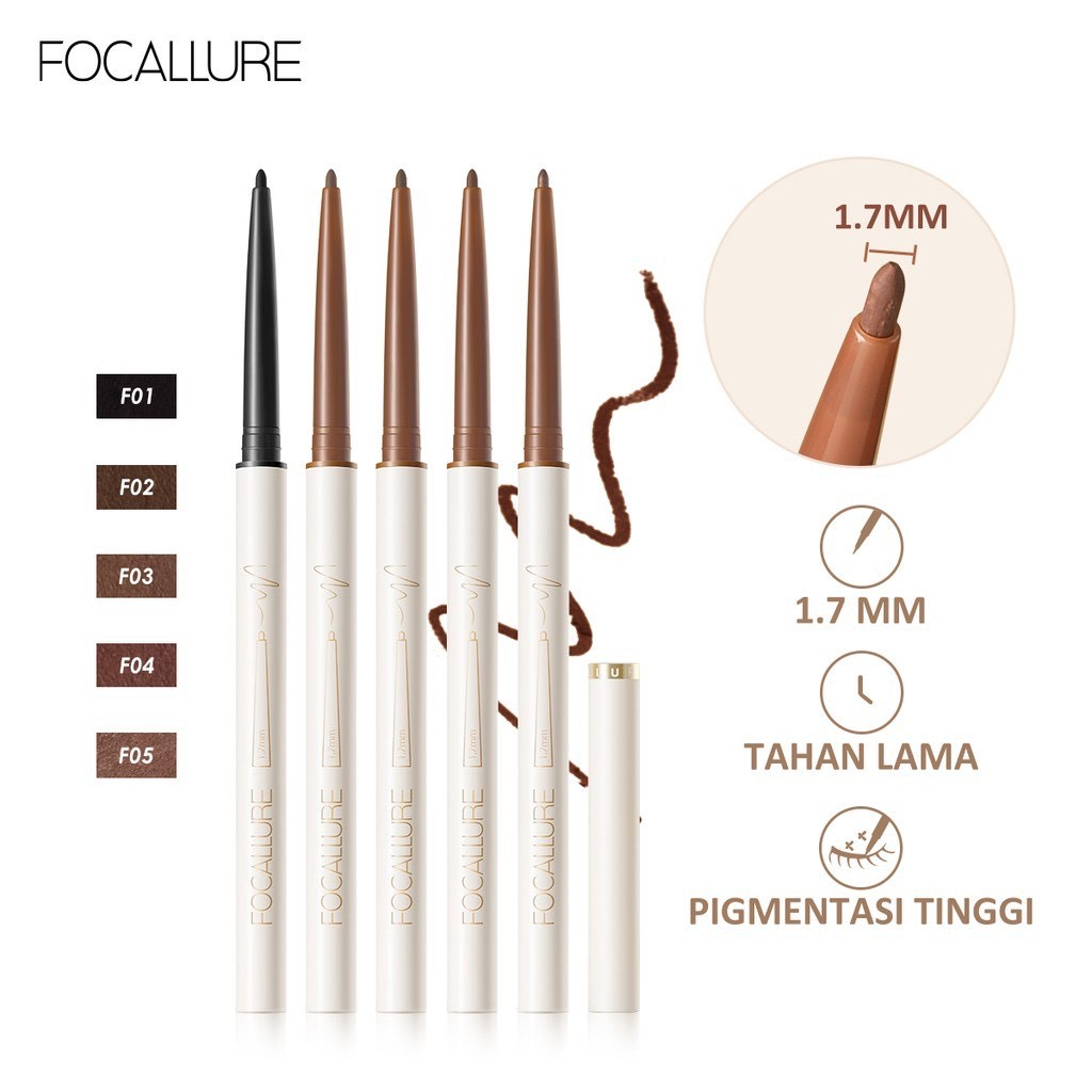 Merk lain: Tidak tahan lama, mudah pudar, tidak anti air, sulit dipadukan, sulit digunakan Merk lain: Ujung pensil tebal, Ujung pensil terlalu kering dan sakit ketika menyentuh kulit Focallure: Tahan lama, anti air, 1.7mm ultra slim, pigmentasi tinggi, halus.
