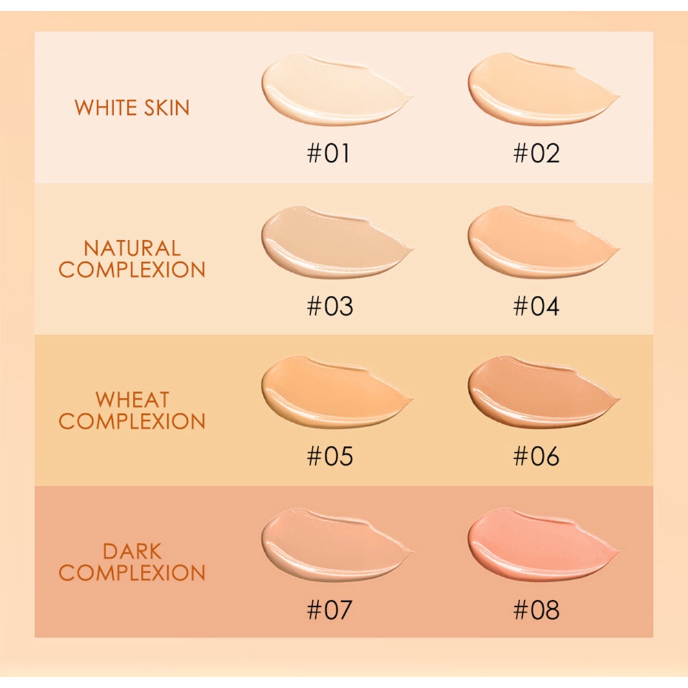 Tersedia dalam 8 warna yang cocok untuk kulit Asia: Warna kulit sangat cerah: 01 Warna kulit cerah: 02 Warna kulit natural: 03 Warna kulit sawo matang: 04, 05 Warna kulit kuning langsat: 06, 07, 08
