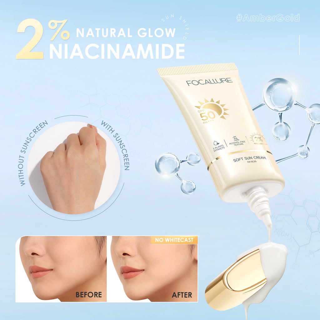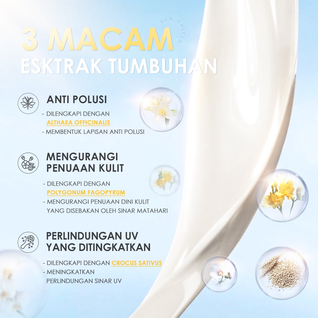 ๐ [Intensive Defense] Enriched with SPF 50 PA+++, it has excellent 360 broad-spectrum protection, not only against UVA rays of skin aging and UVB rays of sunburn but also against blue light for intensive UV shield; and add POLYGONUM FAGOPYRUM and CROCUS SATIVUS two plant extracts to reduce the risk of sun-induced skin cancer ๐ [Anti-pollution] Added ALTHAEA OFFICINALIS plant extract, which can protect the skin from directly touching pollution particles and form an anti-pollution protective film ๐ [2% NIACINAMIDE] Add 2% Niacinamide to inhibit melanin growth, correct and naturally brighten skin tone ๐ [HYALURONIC ACID] Added the best moisturizing ingredients HYALURONIC ACID, to keep skin soft and supple ๐ [Ingredient Safe] Alcohol-free, mineral oil-free, mild ingredients, non-comedogenic, suitable for all skin types, best for dry skin