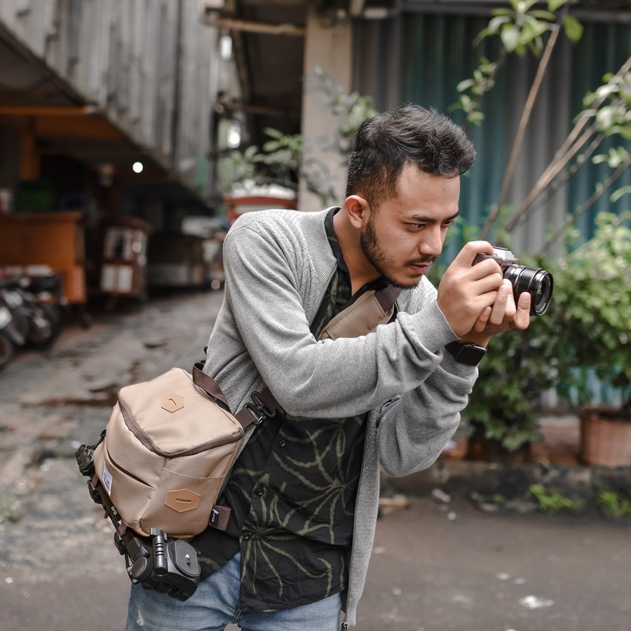 Tas kamera selempang ukuran menengah dengan fungsi maksimal yang bisa memuat mirrorless hingga DSLR tipe standar dengan lensa kit bawaan