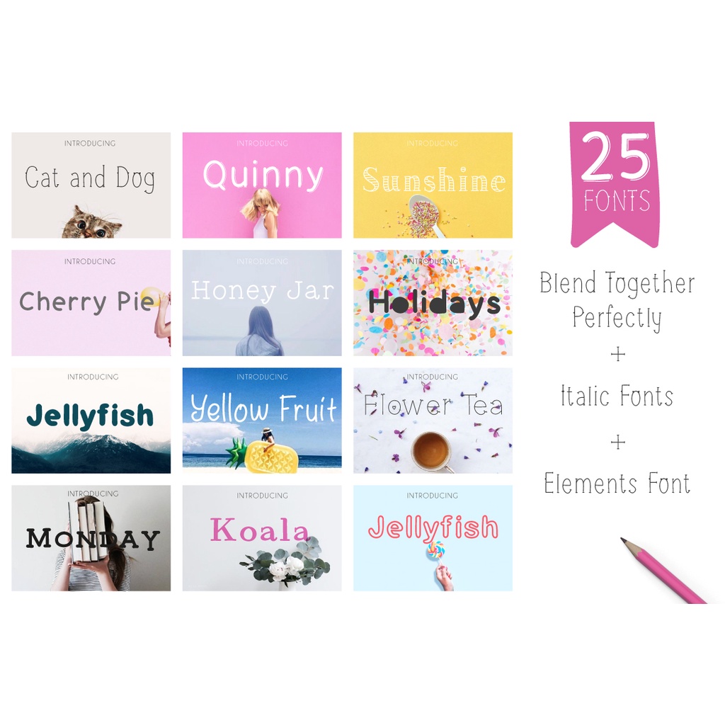 Cat and Dog (Display + Italic); Quinny (Display + Italic); Sunshine (Display + Italic); Cherry Pie (Display + Italic); Honey Jar (Display + Italic); Holidays (Display + Italic); Jellyfish (Display + Italic); Yellow Fruit (Display + Italic); Flower Tea (Display + Italic); Monday (Display + Italic); Koala (Display + Italic); Jellyfish Outline (Display + Italic); Elements Font.