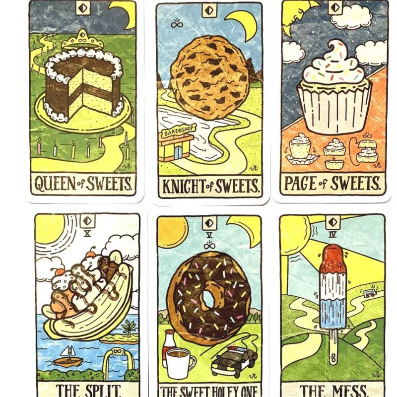 This playful take on tarot makes divining the sacred mysteries of "what's for dinner tonight?" a snap. Simply lay the cards out three at a time and voila—a meal appears, a vision from the spirit realm. This dining divination game can be played alone or with hungry friends to give apathetic appetites a mystical nudge in the right direction.