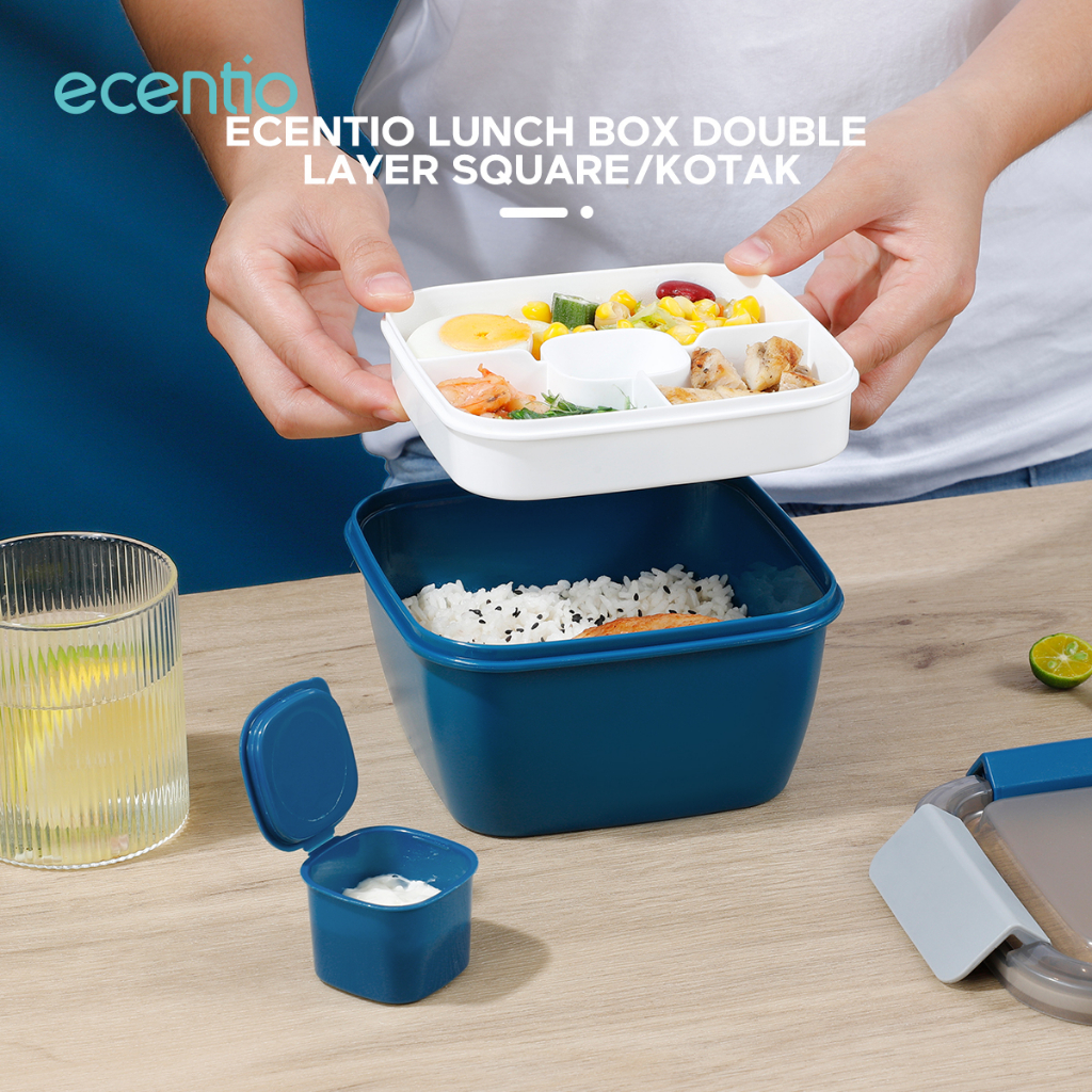 ❤kotak bekal tempat makan 2 susun 1100ml portabel dan sauce box anti tumpah : Merek: ecentio Bahan: pp Ukuran produk: 15.4*15.4*8.7cm Warna: Biru Kapasitas: 1.1L Berat bersih : 203g, berat kotor : 207g Ukuran kemasan: 15.4*15.4*8.7cm Daftar produk: kotak makan siang * 1 pcs, garpu dan sendok * 1 pcs, kotak sambal * 1 pcs