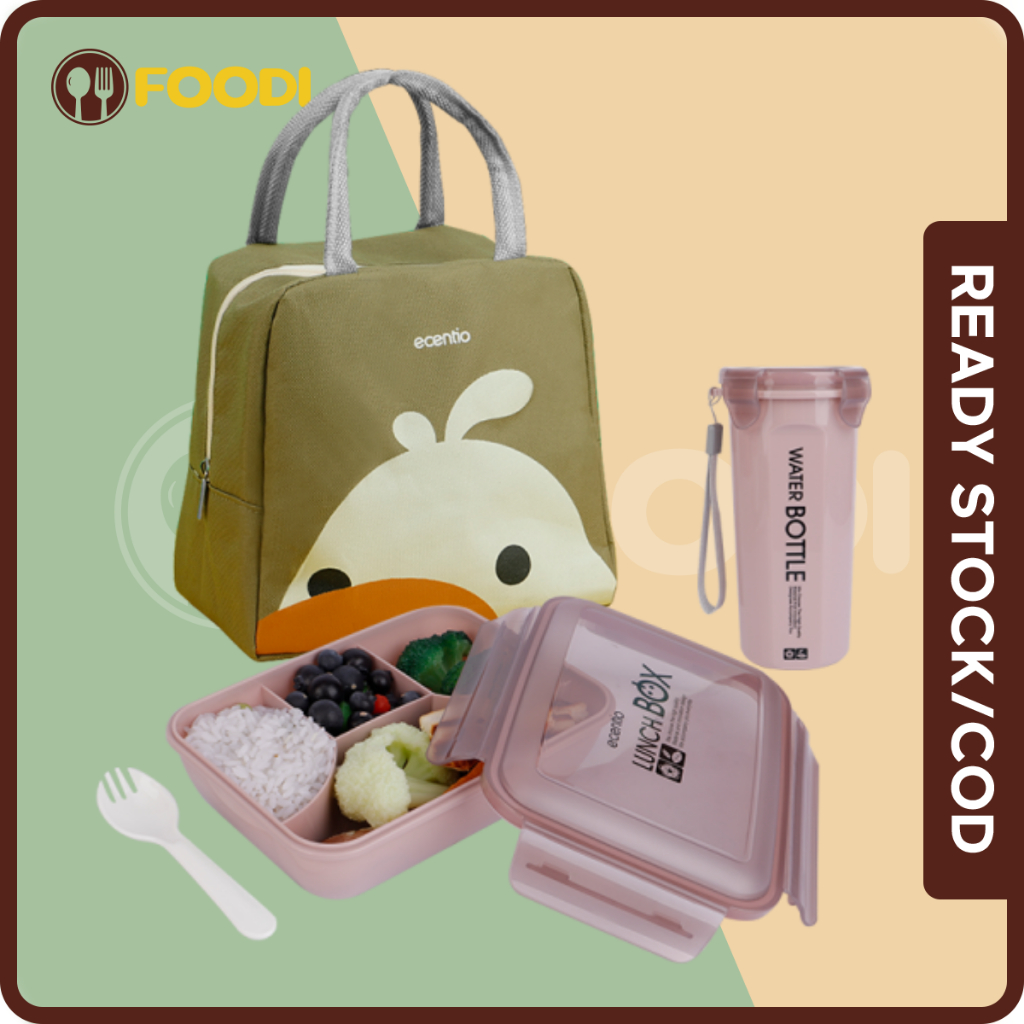 Perlengkapan Rumah > Peralatan Dapur > Tempat Penyimpanan Makanan > FOODI Lunch Bento Box anak Set 4 Sekat 1100ml tas bekal makanan dan botol minum 500ml 3 pcs/Tempat Makan anti tumpah/Free Sendok