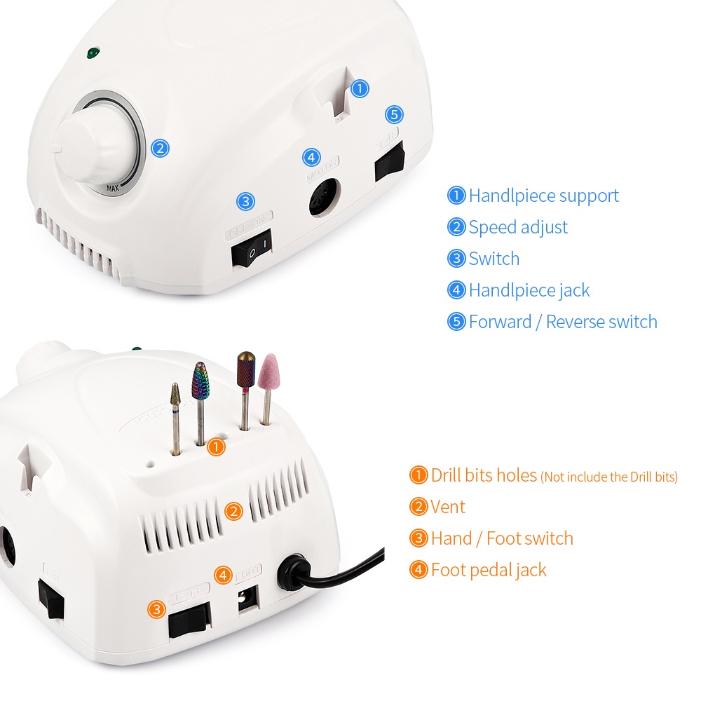 Features: 1.Mini-compact design, smart light weight ergonomic design handpiece, slim metal nozzle effectively reduce the fatigue of long hours of work. 2.Ultra-quiet motor and extremely smooth operation. Improved bearings and balance provide highly concentric design. 3.Convenient twist dual lock/unlock chuck provides safe and secure holding. 4.Easy maintenance of Carboloy brush, no sparkle disturbance and have better torque and durability 5.Professional nail machine designed for use in beauty salons.