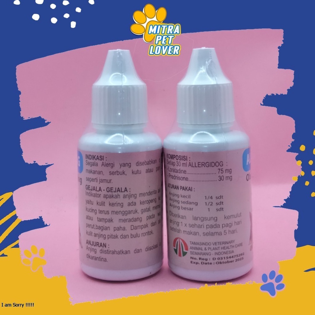 Dosis : Kucing kecil ......... 1/4 sdt 1 kali sehari Kucing sedang ..... 1/2 sdt 1 kali sehari Kucing besar ........ 1 Sdt 1 kali sehari berikan setelah makan selama 5 hari. Jangan diberikan dalam keadaan perut kosong Indikasi : Mengobati segala alergi yang disebabkan oleh debu, makanan, kutu, parasit atau jamur Komposisi : Setiap 30ml Allergi Dog mengandung : - Loratadine .......... 75 mg - Prednisone ......... 20mg Anjuran : Anjing diistirahatkan dan diisolasi. Kandang dan lingkungan dibersihkan
