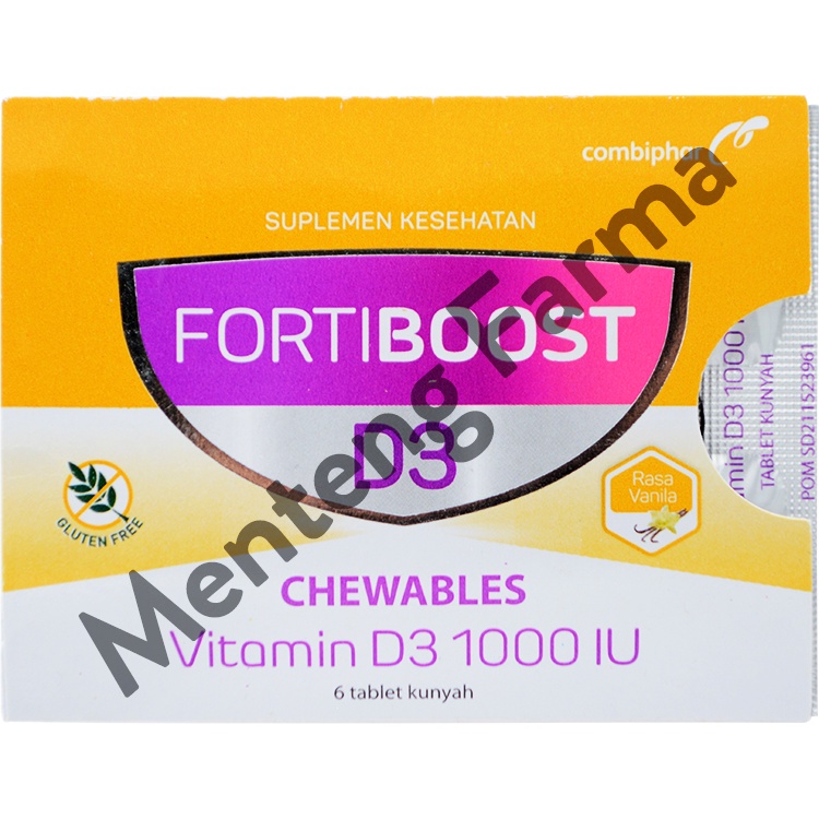 Deskripsi : Fortiboost D3 1000 IU adalah Vitamin D3 1000 IU dalam bentuk tablet kunyah dengan rasa vanilla yang enak dan juga bebas gluten. Fortiboost D3 1000 IU berfungsi untuk membantu menjaga kesehatan 36 organ vital serta memenuhi kebutuhan Vitamin D dengan cepat pada kondisi tertentu seperti lanjut usia, ibu hamil dan menyusui, resiko tinggi/penderita penyakit infeksi, atau penderita autoimun.
