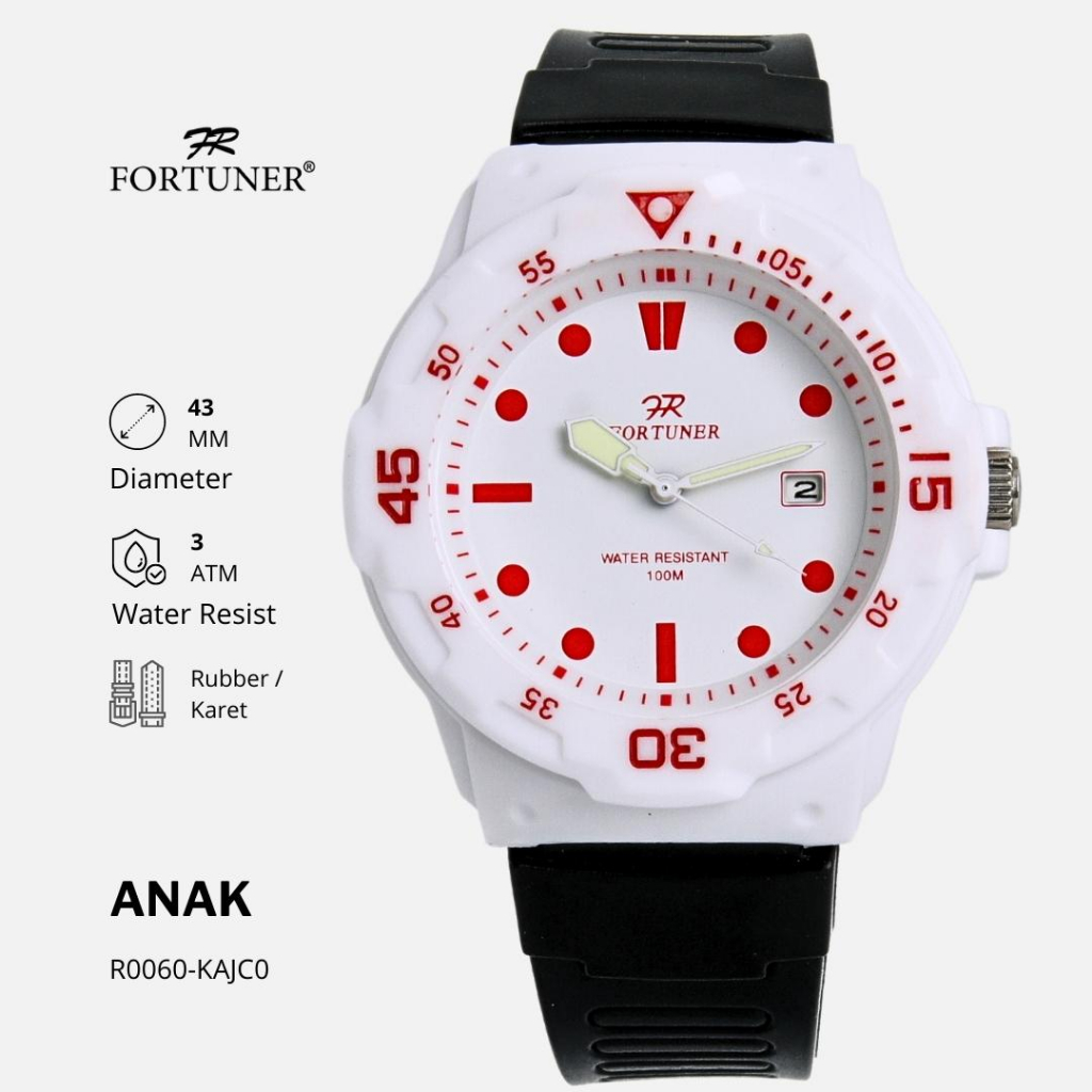 Brand : Fortuner Model No : R0060 Series : R Usia : Min. 7 Tahun Gender : Anak-Anak (Cowok & Cewek) Kalendar : Tanggal Bercahaya : Dalam Gelap Case diameter : 4,3cm Tebal case: 1,2cm Tipe Dial : Analog Case material : Silicon (Rubber/Silicon/Resin) Material Kaca : Plastik Strap/Band material : Silicon (Rubber/Silicon/Resin) Strap Type : Rubber Lebar Strap: 1,8cm Panjang Strap: 17cm Jenis Pengunci Tali : Buckle Water Resistant : 30 Meter (3 ATM/BAR) Bisa untuk berenang Movement : Quartz Movement Garansi : 3 Bulan, Garansi Resmi Berat setelah packing : Kira-kira. 200 gram Isi Paket : Jam Tangan, Kartu Garansi Fortuner, Fortuner Watch Box.