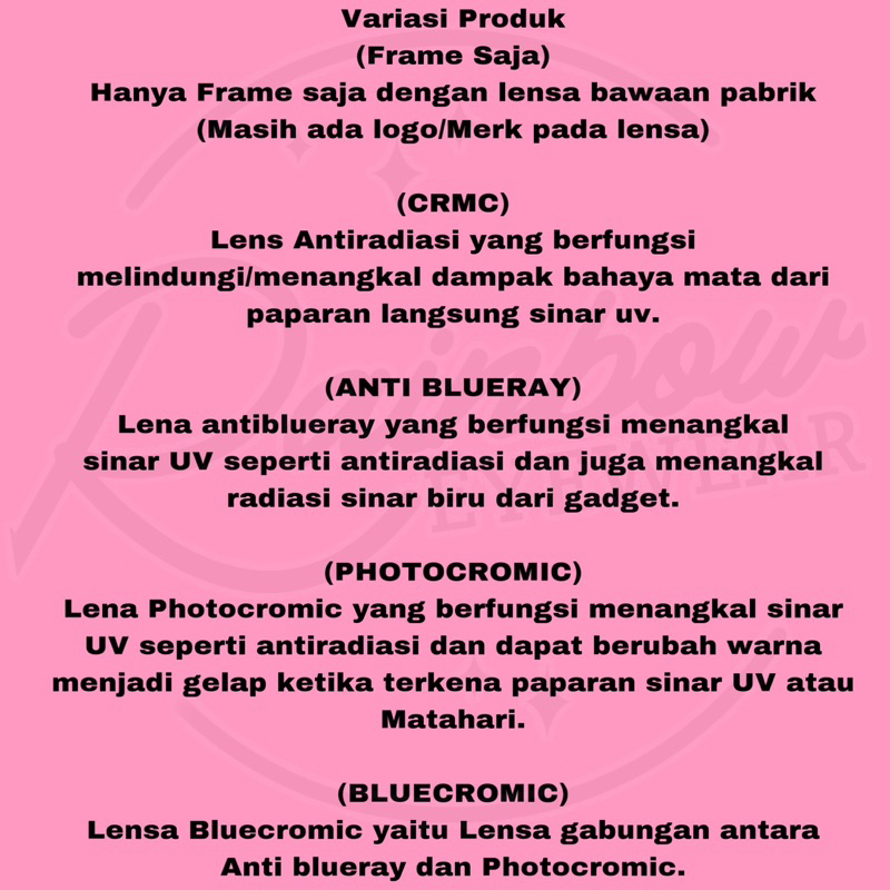 HARGA SUDAH TERMASUK LENSA DENGAN UKURAN : Pilihan Ukuran : - Plano / Norma ( 0,00) Anti Radiasi - Minus : -0,25 s/d -4,00 dan Cyl -2,00 - Plus : +0,25 s/d +2,00 Tnp Cylinder (CRMC) ( Tidak berlaku untuk lensa Double Seperti Progresif / kryptok )