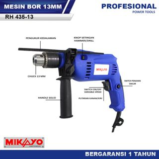 ✔️MESIN BOR MIKAYO 13mm RH435-13 Mesin Bor MIKAYO ini memiliki diameter maksimal mata bor 13mm dengan harga ekonomis namun dengan kualitas dan tenaga yang tidak kalah dengan merk lain. Dengan daya listrik 580 watt bor ini sanggup digunakan untuk pengeboran kayu dan besi. Mesin Bor 13mm MIKAYO ini dilengkapi dengan fitur reversible / putaran bolak balik dan hammer drill untuk pengeboran tembok/beton.