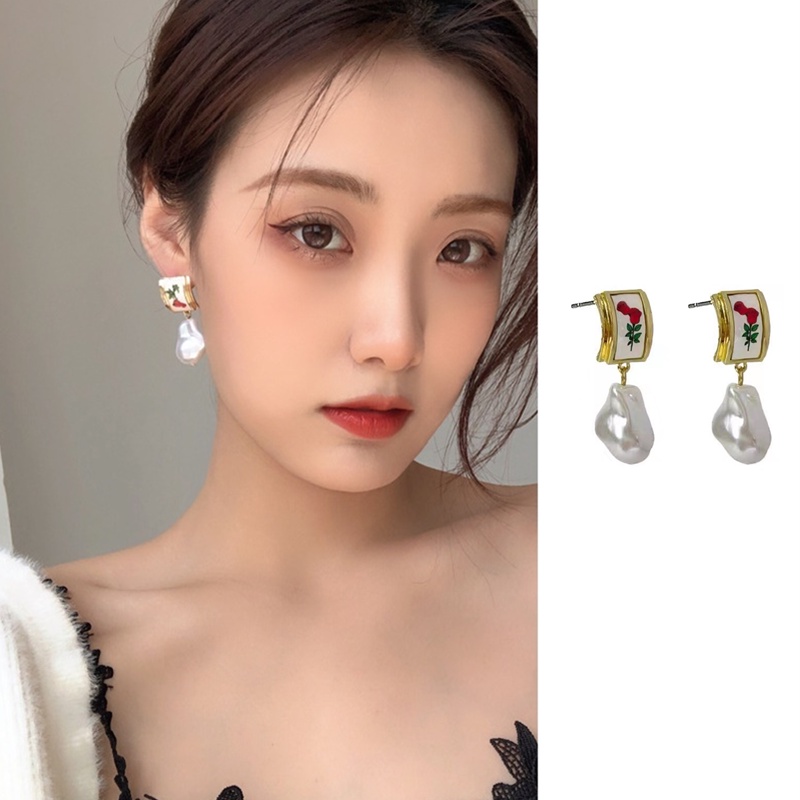 Detail French Red Rose Flower Earrings Baroque Spesial-shaped Pearl Retro Hong Kong Style Cahaya Mewah High-end Stud Earrings