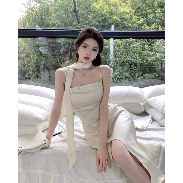 Detail ✹◐✥French satin halter neck strap dress women s summer sexy waist slit skirt temperamen bag hip skirt rok panjang