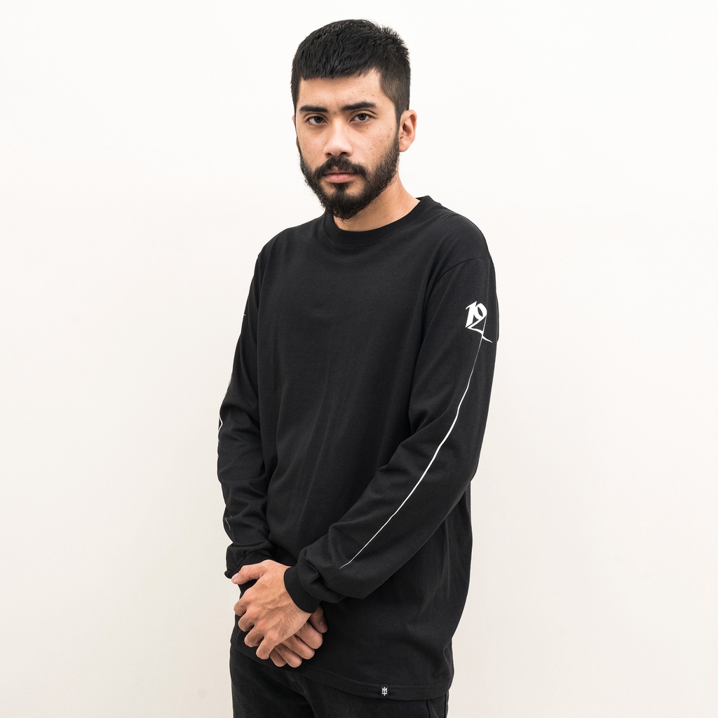 Black 20s cotton long sleeve T-shirts, open-end yarn, 100% cotton, tubular fit, seamless double needle 2cm collar, taped neck and shoulders, satin & cotton label, rib cuffs, double needle bottom hem, white plastisol ink screen print.