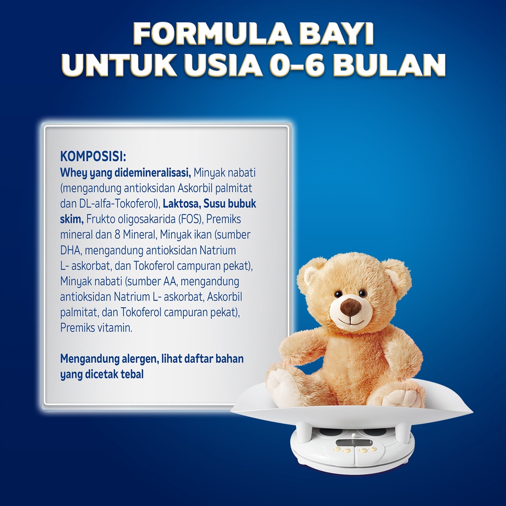 Frisian Baby PRIMAMIL 0-6 Bulan mengandung: ● DHA:AA, masing-masing sebanyak 51mg dengan rasio perbandingan 1:1 untuk bersinergi maksimal dalam pembentukan sel syaraf otak bayi. Didukung oleh Asam Sialat & Sphingomyelin ● 9AAE (9 Asam Amino Esensial) yang merupakan protein luar biasa untuk dukung tumbuh kembang si Kecil secara prima, yang sayangnya tidak dapat diproduksi sendiri oleh tubuh ● 10% Laktosa dan dominan protein whey, yang merupakan bentuk karbohidrat dan protein sederhana sehingga mudah diserap oleh pencernaan bayi yang belum sempurna ● Prebiotik FOS untuk meningkatkan kinerja pencernaan si Kecil sehingga terhindar dari risiko konstipasi dan kolik yang biasanya menyebabkan ia sering menangis di malam hari ● 14 Nutrisi penting lainnya seperti omega 3, 6, vitamin A, C, E, zinc, selenium, kalsium, vitamin D3. Tanpa sukrosa