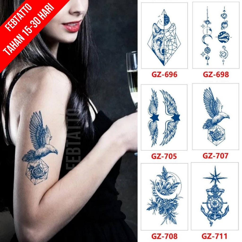 Video perkenalan produk FRUIT INK Tato Semi Pemanent Tahan 1 Bulan Ukuran 11cmx18cm Tato Lengan Tato Dada Tato tangan Tato Kaki Tato Punggung Tato Jari Motif Aesthetic Tatto Temporary Stiker Tato Halal Grosir Tato air motif bunga, jangkar, burung, sayap, planet, serigala GZ 707. Sumber: Shopee.