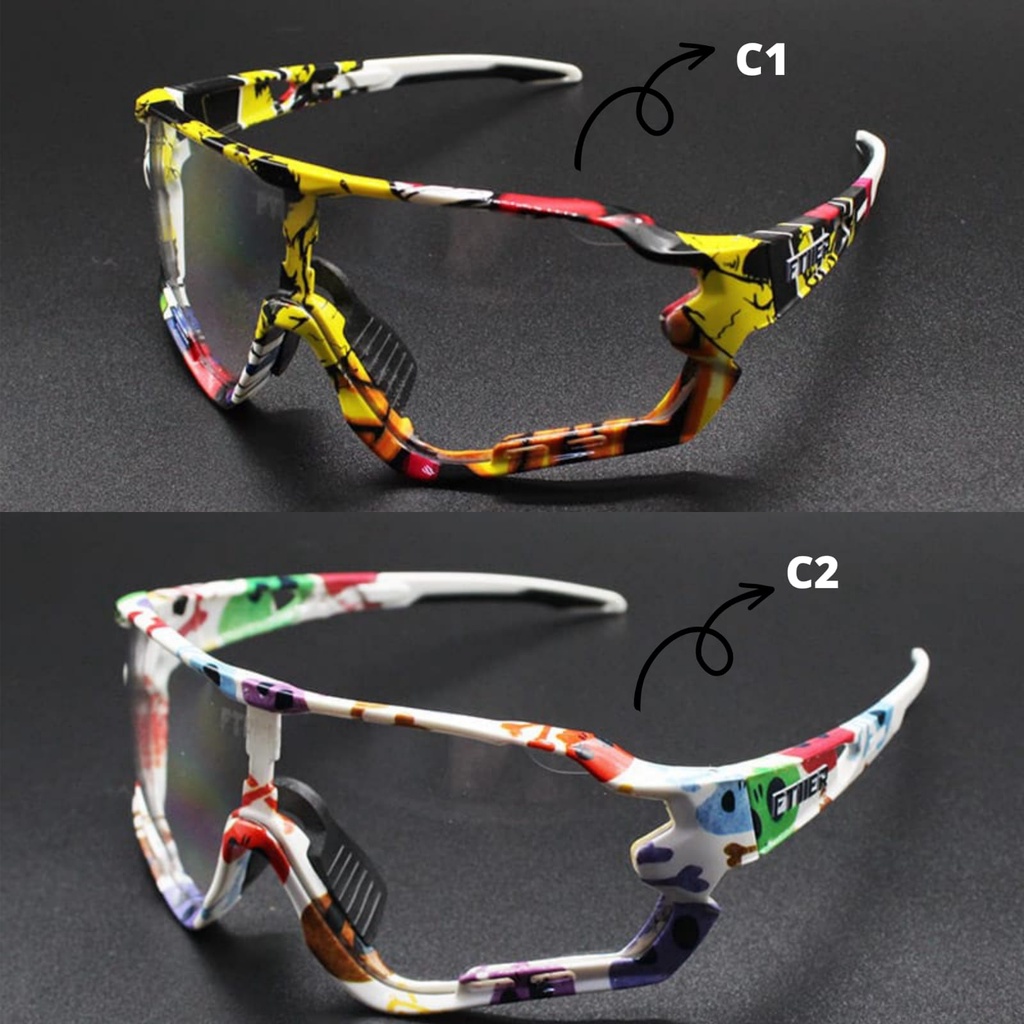 Photocromic, berubah warna menjadi gelap saat terpapar sinar UV matahari Aman untuk sepeda disaat kondisi kurang cahaya dan tetap nyaman saat kondisi silau. warna lensa yang dimaksud adalah kondisi terpapar sinar UV matahari. C1 adalah warna frame. padding hidung karet. Bahan Polycarbonate terrmasuk kotak penyimpanan hard case.