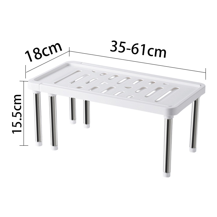 Nama: Rak Dapur Ukuran: (35-61)x18x15.5 cm Warna : Putih Abu Muda Berat: 320 Bahan: logam stainless steel, plastik Fitur: kuat, menahan beban, terukur