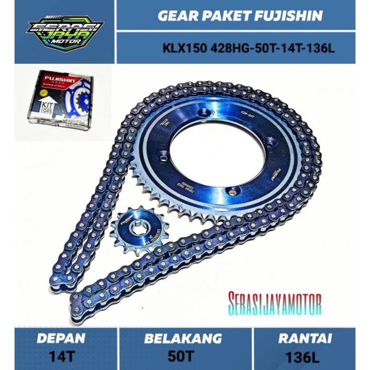 Nama Produk : Gear Paket Fujishin Quality Part Ukuran Gir : 428HG Gir Depan : 14T Gir Belakang :50T Panjang Rantai :136T