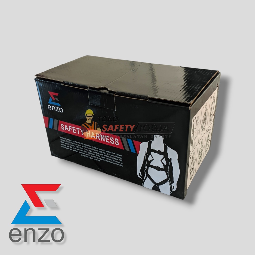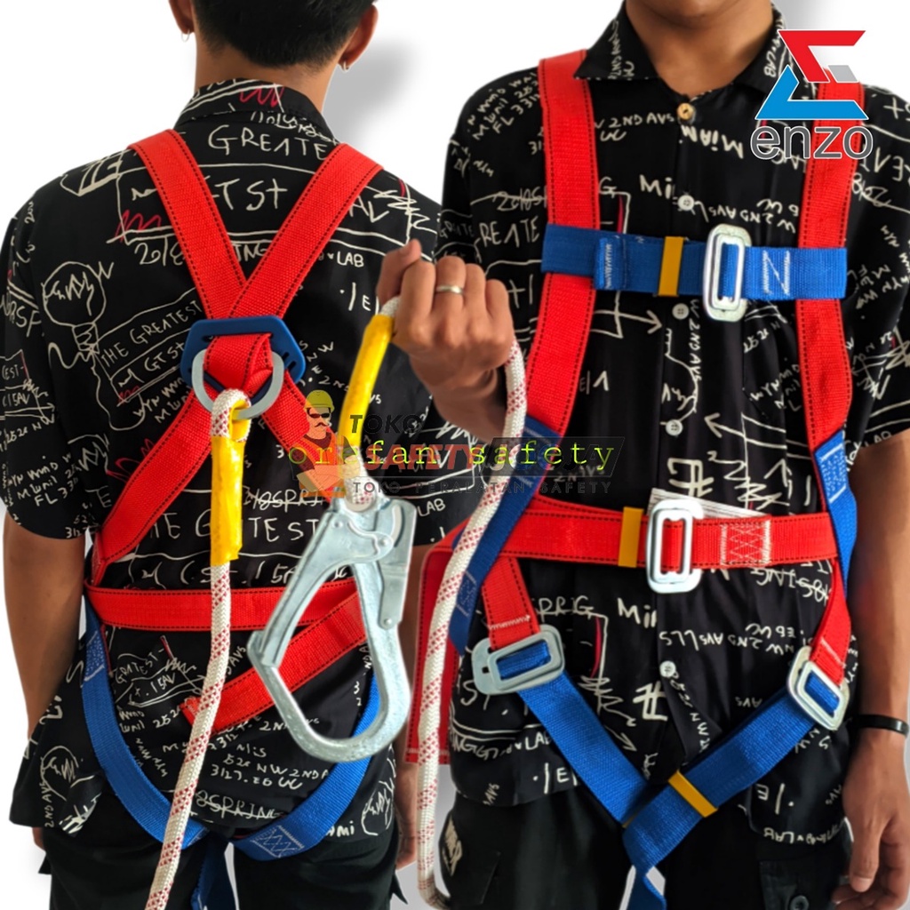 Brand: enzo Model: Full Body Harness enzo Size: Universal Back D-ring: Yes Adjustable Point: 4 Chest Strap Buckles: Standard (Lengkap dengan Tali Dada) Leg Strap Buckles: Standard Webbing Material: Polyester Webbing Width: 50mm Absorber: No Hook: Big Hook Carabiner: No Working length: 1.8M