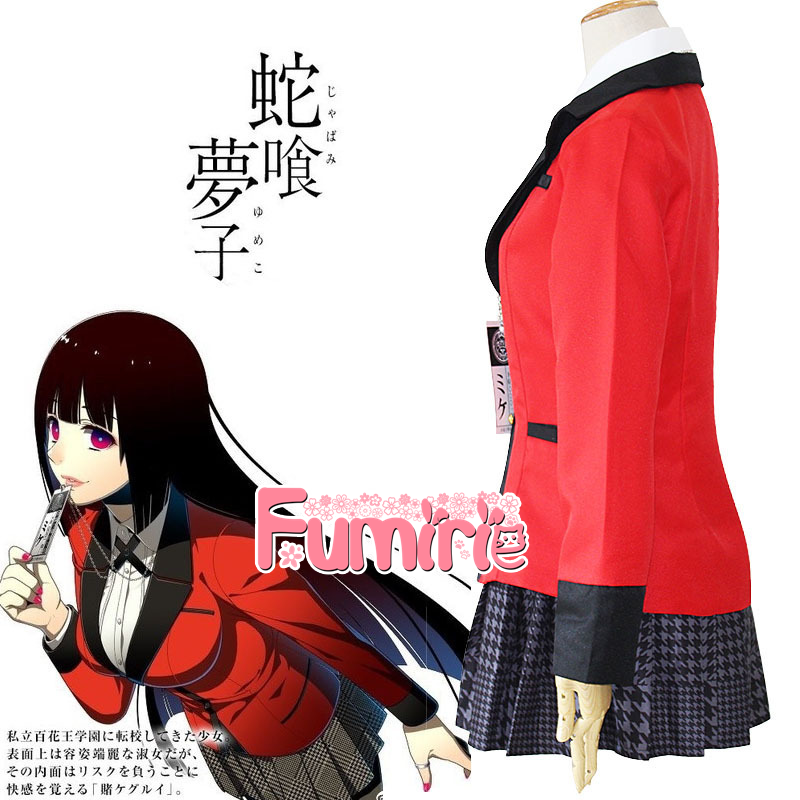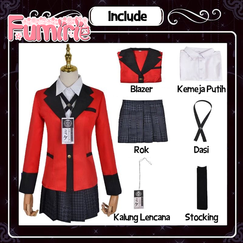 Selama iklan masih ada, berarti ready stock ya. Langsung order aja ya 🥰 --------------------------------------------------------------------------- 1 Set Costume Kakegurui Yumeko Jabami / Saotome Mary Blazer + Kemeja Putih + Rok + Dasi + Kalung Lencana + Free Stocking Hitam ----------------------------------------------------------------------------