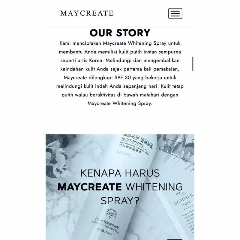 Manfaat Maycreate Isolation Spray : 1. Mengandung bahan alami berbentuk spray cairan yg lembut dan ringan mudah meresap ke kulit 2. Memperbaiki skaligus melembabkan kulit, dan anti aging penuaan dini / keriput 3. Menyegarkan kulit dengan tekstur yg lembut dan tidak lengket. 4. Melindungi kulit dari sinar UV matahari, dengan cepat memperbaiki kerusakan kulit skaligus menutrisi kulit yg kusam 5. Efek waterproof tahan lama sehingga awet dikulit dan memberikan perlindungan seluruh badan