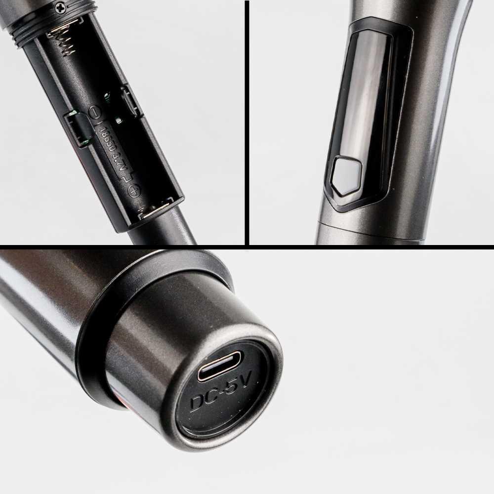Tenaga Baterai Isi Ulang Mikrofon karaoke ini menggunakan 1buah baterai 18650 dengan kapasitas 1200 mAh yang dapat digunakan selama 10-12 jam. Baterai terpasang di bagian bodi mikrofon dan bisa Anda lepas pasang sesuai dengan kebutuhan.