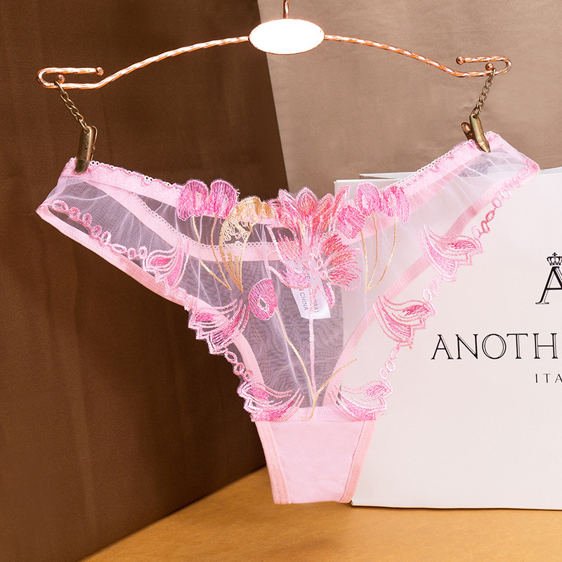 Detail G String Wanita Pola bunga bordir Transparan Sexy Celana Dalam Pinggang Rendah c218