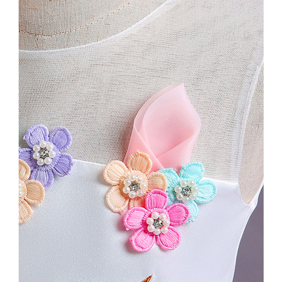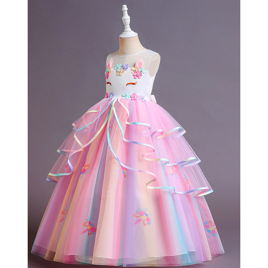 Gaun Tulle Warna Pelangi dengan Desain Unicorn & Bunga 3D