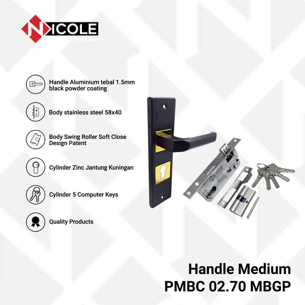 Nicole Gagang Pintu Medium Hitam Set Dengan Body Nicole Swing Roller + Cylinder Hitam 5 Anak Kunci Komputer