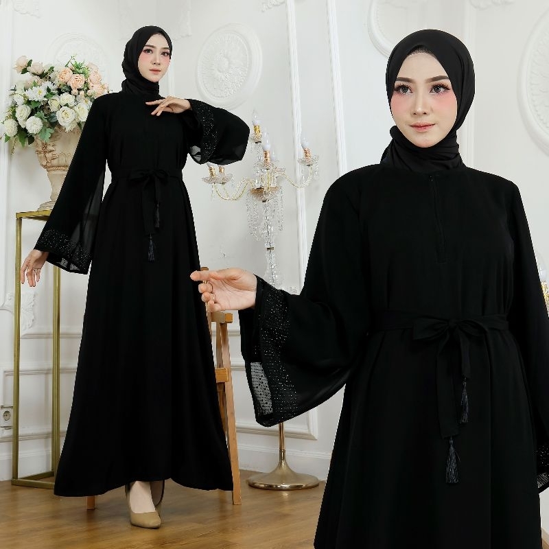 *NEWWWW Abaya Dubai 864 Swarosvky* Bahan jetblack premiun Kombinasi sifon saudi Bertaburkan swaroski Free belt kincir cantik ( bisa dilepas ) Reseleting depan / Busui Freindly Ready size s m l xl