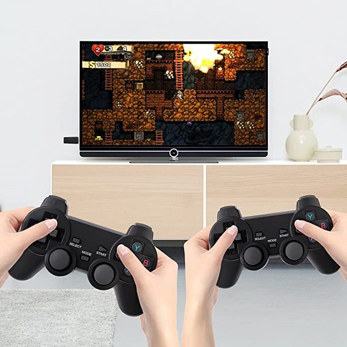 đźă2 PLAYERS / WIRELESS GAMEPADSă Support two players with two 2.4G wireless gamepads, make you enjoy playing games with family or friends on the sofa at home with no limit. đźăHIGH DEFINITION HDMI OUTPUTă Support high definition HDMI output, can connect to TV/TV Set-top Box/PC/Laptop/Projector. đźăEASY & SIMPLEă Three steps to perpare: 1) Connect Game Stick to TV HDMI slot. 2) Connect power cable to Game Stick and power adapter (USB power output slot). 3) Adjust the TV signal sourse to HDMI channel, and display the game list. đźăTIPSă 1) Exit game: Press SECECT + START for two seconds. 2) Each gamepad needs 2 x AAA batteries(not included). 3) Games can be saved, collected, searched. 4) Support multiple languages. The language of game list can be changed easily.