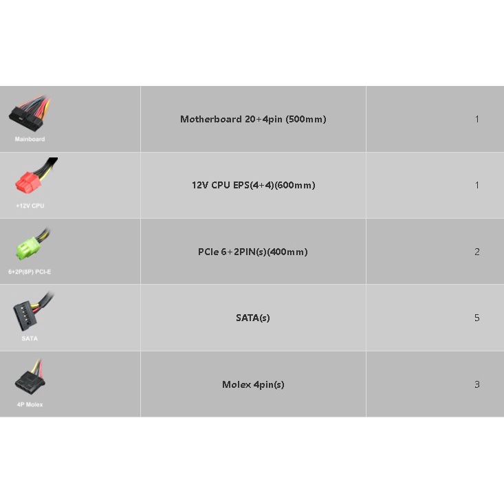 VP-700 Technical Specifications 80PLUS® APFC 80+ Plus Compliant Efficiency Level 80+ Bronze Noise Level Zero (ECO-ON),<32dBA (at 100% load) Form Factor Intel ATX 12 V 2.31 Dimensions 140 mm (W) x 150 mm (L) x 86 mm (H) Fan Information Fan Size 120 mm Fan Control ECO-ON/OFF Fan Bearing Fluid Dynamic Bearing Life Expectancy 50,000 hours at 40 °C, 15 % - 65 % RH Cable Information Modularity Wired Cabling Cable type Black tube shield along with colors CPU and PCIe connecor Electrical Features Operating Temperature 0 - 50 °C (derating from 100 % to 80 % from 40 °C to 50 °C) MTBF @ 25 °C, excl. fan 100,000 hours AC Input Full Range AC input (100-240Vac) Protection OPP, OVP, UVP, OCP, OTP, SCP Safety and Environmental Safety and EMC CB, CCC,CE Environmental Compliance RoHS, WEEE, ErP Lot 6