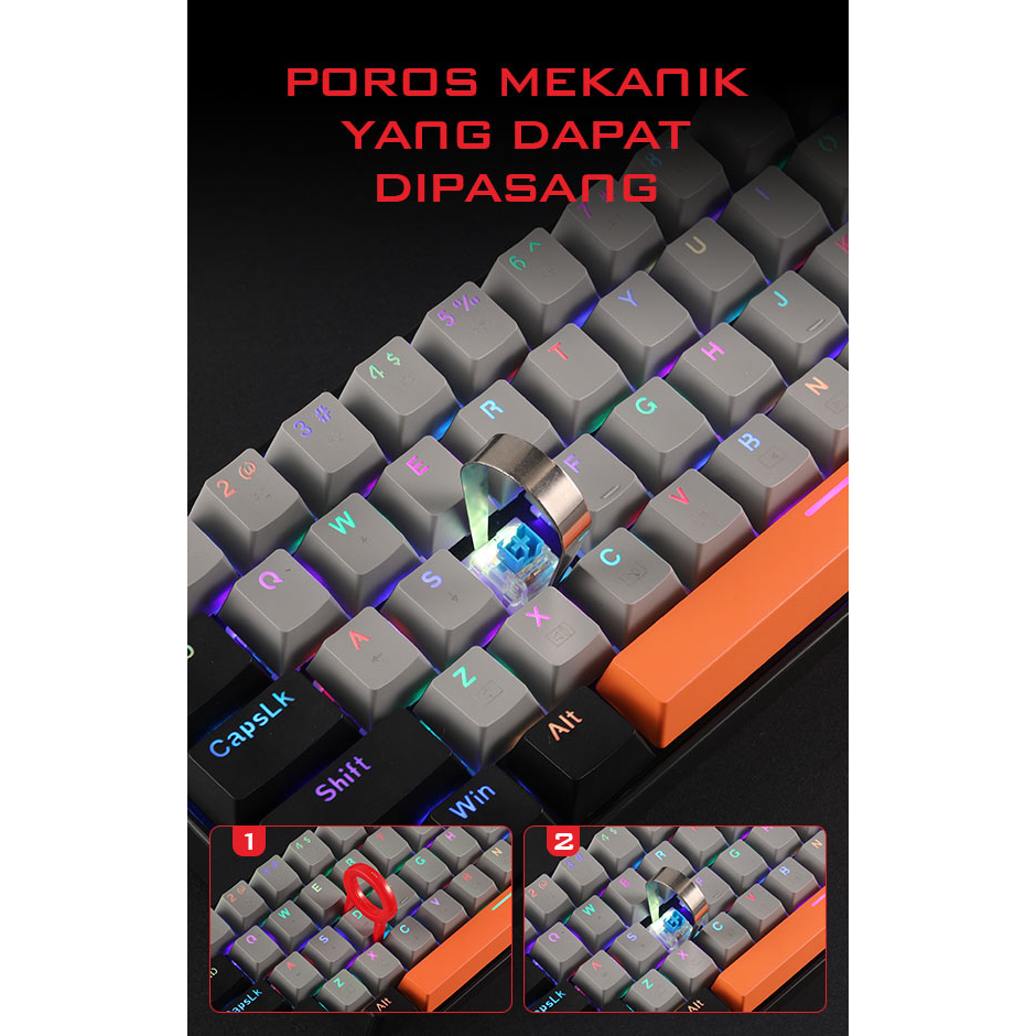 💎Keunggulan: 1. Outemu Blue Switch, tombol yang kuatdengan ketahanan 50 juta kali 2. Swappable 3 pin switch 3. Kualitas Switch A+ 4. 16 mode warna RGB backlight, suasana bermain game jadi lebih menyenangkan 5. Poros mekanis yang dapat dipasang 6. 66 tombol dengan letak yang ringkas 7. Ergonomic design sehingga bermain lebih nyaman 8. Keycaps bahan PBT, kuat dan tahan lama daripada bahan ABS 9. Dilengkapi 2 kaki anti slip 10. Cocok untuk gamer, pekerja kantor sekolah dan lain-lain