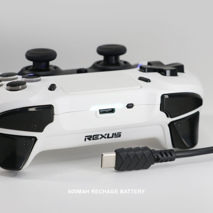 Desain gamepad ini ergonomis dan nyaman dengan textured handgrip agar tidak mudah terselip saat bermain. Dilengkapi dengan lubang stereofonik TRRS 3.5mm untuk support mikrofon dan headset. Terdapat touchpad function, hall magnet triggers sensor, dan six axis sensor function yang tentunya mempermudah permainan Anda. Fungsionalitas tidak lepas juga dari kapasitas baterai yang besar yaitu 600 mAh yang dapat Anda isi dayanya dengan kabel type C to USB.