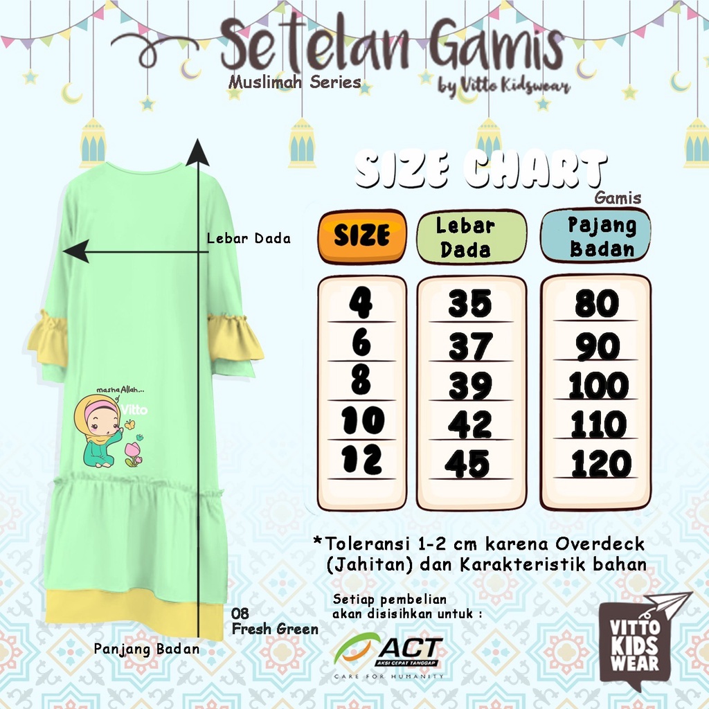 🔅BM-228 : GAMIS ANAK VITTO SET KERUDUNG -Bahan gamis cotton combed 24s sablon GL foam -Bahan kerudung double knit polyester dan label woven -Model gamis rumple bagian lengan dan ujung badan, sambungan bahan double knit PE -Set dengan kerudung masker