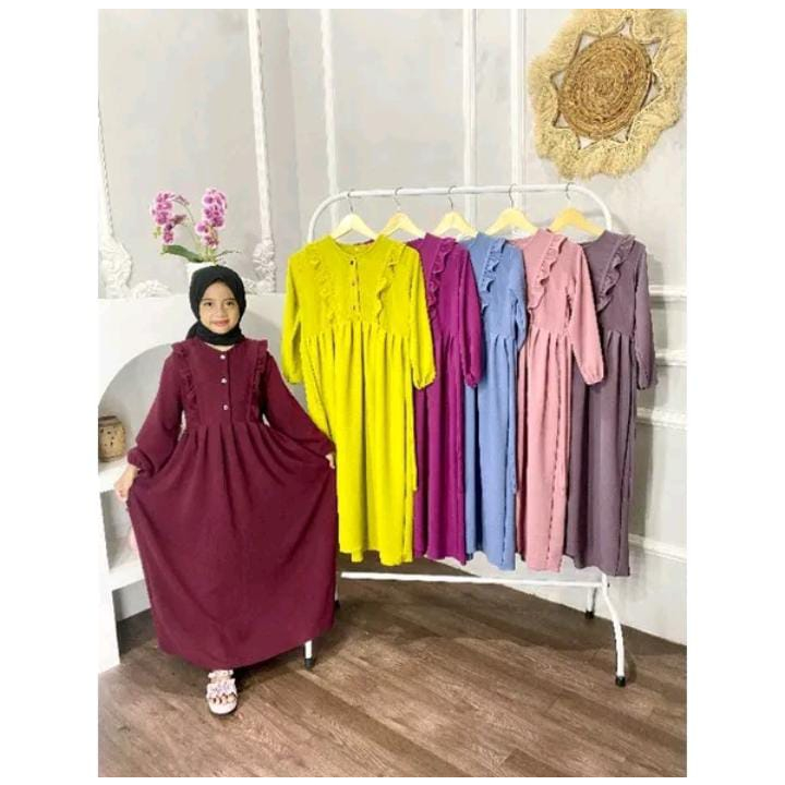 Gamis anak tanggung Bahan crinkle airflow, bahannya adem banget ya kakak bisa melar juga, dengan rempel di depan dan tiga kancing hidup didepan, juga ada tali samping kanan dan kiri