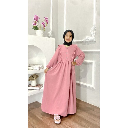 Gamis anak tanggung Bahan crinkle airflow, bahannya adem banget ya kakak bisa melar juga, dengan rempel di depan dan tiga kancing hidup didepan, juga ada tali samping kanan dan kiri