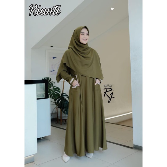 Rianti set hijab ori RJ Bahan yoriss fluid Size S m l xl xxl Ld 95.100.105.110.115 PB 135.137.140 Busui Aksen renda Saku kanan kiri Tali kanan kiri