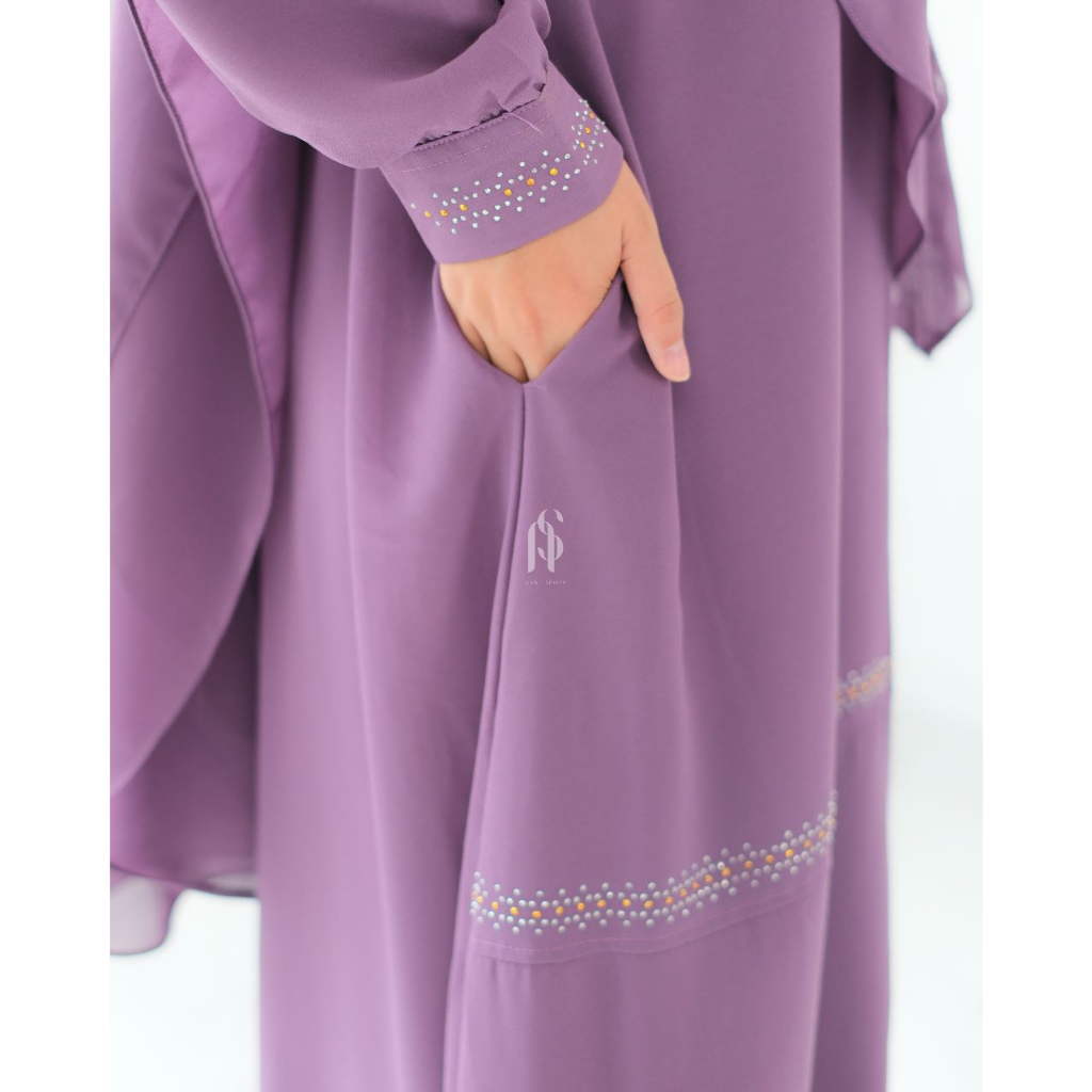 Details Nanabil set hijab Rits depan Bahan ceruty babydoll berfuring Aksen Payet Manset kancing Ada saku Ld 110 PB 140 Khimar ceruty babydoll 95/120