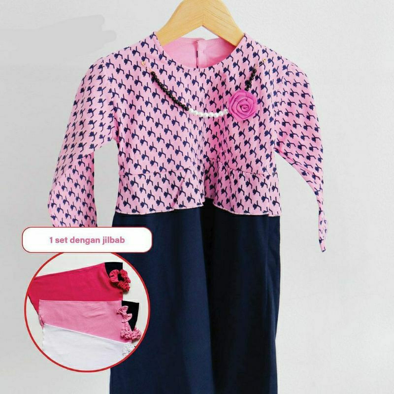 Gamis+hijab anak motif mawar, bahan lembut dan nyaman jika dipakai, 100% Cotton menyerap keringat, bahan berkualitas ya moms, tidak panas dan tidak tipis.