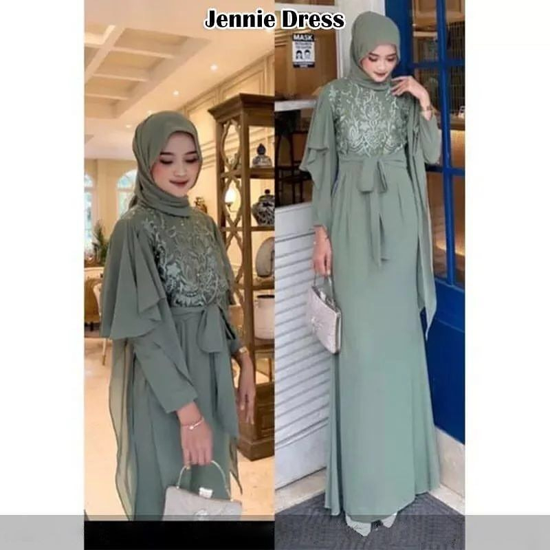 Detail Gamis jennie dress bahan ceruty mix brukat / busui / resleting depan original