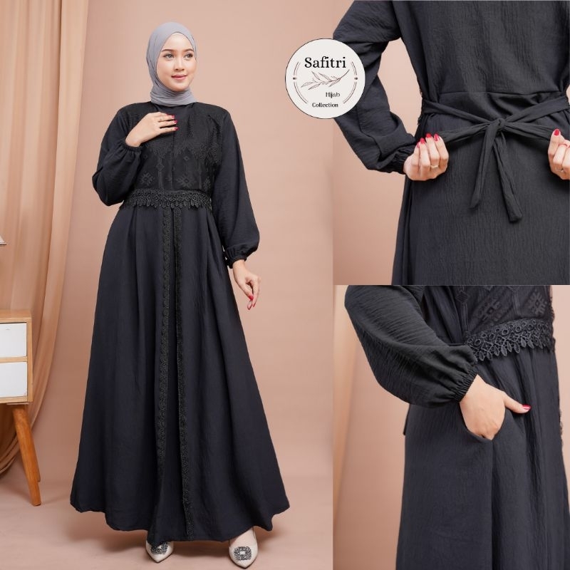 Deskripsi Produk ; โข Bahan : Crinkle Airflow โข Ukuran : S (Lebar Dada; 90, Panjang Badan; 130 cm) M (Lebar Dada; 100 cm, Panjang Badan; 135 cm) L (Lebar Dada; 110 cm, Panjang Badan; 140 cm) XL (Lebar Dada; 120 cm, Panjang Badan; 140 cm) โข Resleting depan (Busui friendly) โข Saku samping โข Tali samping (Kanan-kiri) โข Lengan karet (Wudlu friendly) โข Dipercantik dengan brukat di bagian dada, serta kombinasi renda di bagian pinggang menjuntai sampai bawah