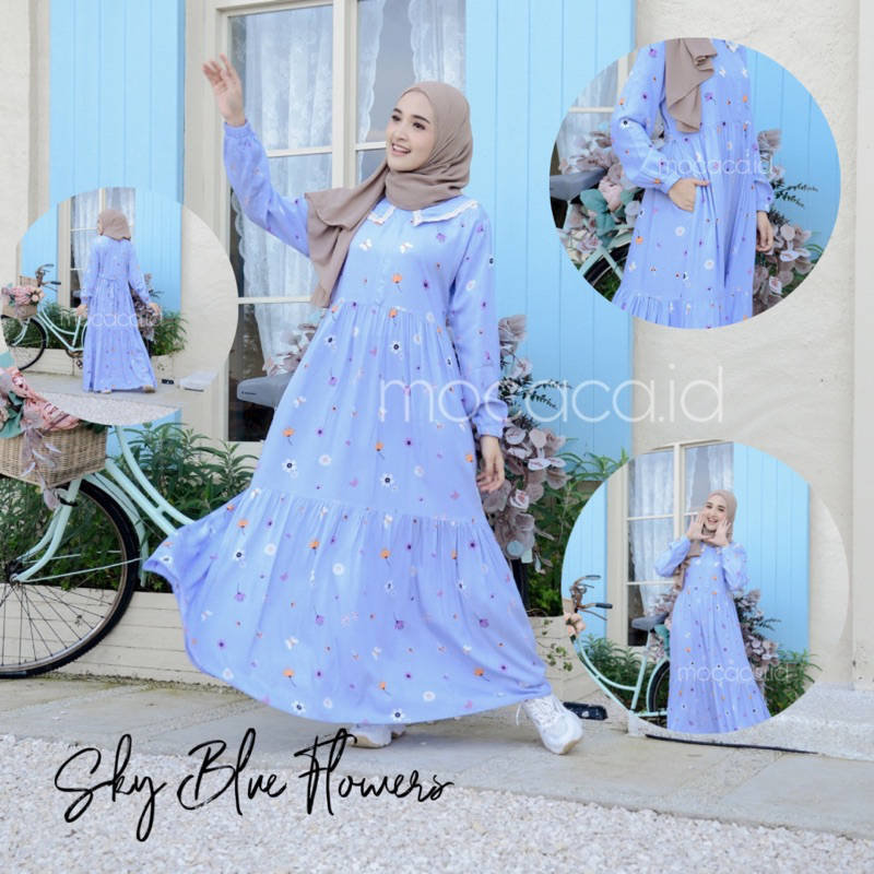 Detail Gamis rumahan renda depan busui rayon premium - motif sky blue flowers