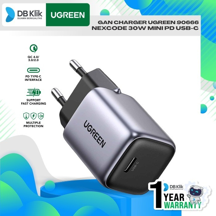 Deskripsi : - Merek : UGREEN - Model : 90666 30W - Nexode GaN Charger - Material : Flame-retardant - Interface : PD Type C - Color : GRAY - Function : Charging -Input : 100-240V, 50-60Hz, 800mA Max -USB-C output : 5V=3A, 9V=3A, 12V=2.5A, 15V=2A, 20V/1.5A, 3.3-11V=2.7A -Multiple Protection : Thermal Guard, Over-Voltage, Over-Current, Short-Circuit, Over-Temperature -Compatibility : PD3.0/2.0, PPS, QC4.0/3.0/2.0, AFC, SCP, FCP