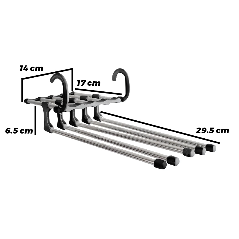 Fitur: Lima batang gantung; 5 in 1 desain rak celana ditarik stainless steel Digunakan untuk menggantung celana Anda dengan rapi dan nyaman Dengan dua kait kecil di kedua ujung setiap batang; Dua cara untuk menggantung rak ini Gunakan dua kait: menjadi horizontal; Gunakan satu kait: menjadi vertikal (menghemat ruang)